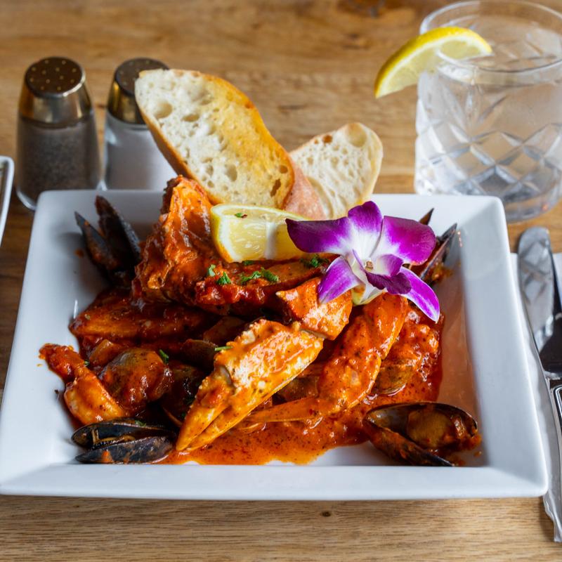 Northwest-caught Pacific salmon, Dungeness crab legs, prawns, cod, Willapa steamers, mussels, Italian tomato seafood broth, and grilled baguette