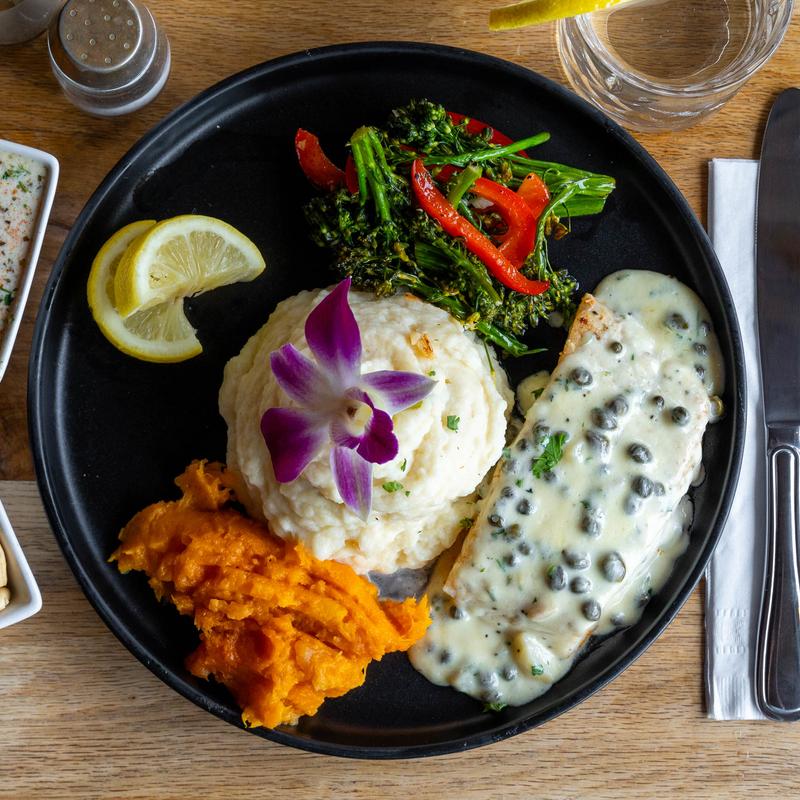 Northwest-caught Pacific halibut fillet, creamy white wine-caper sauce, and lemon wedge