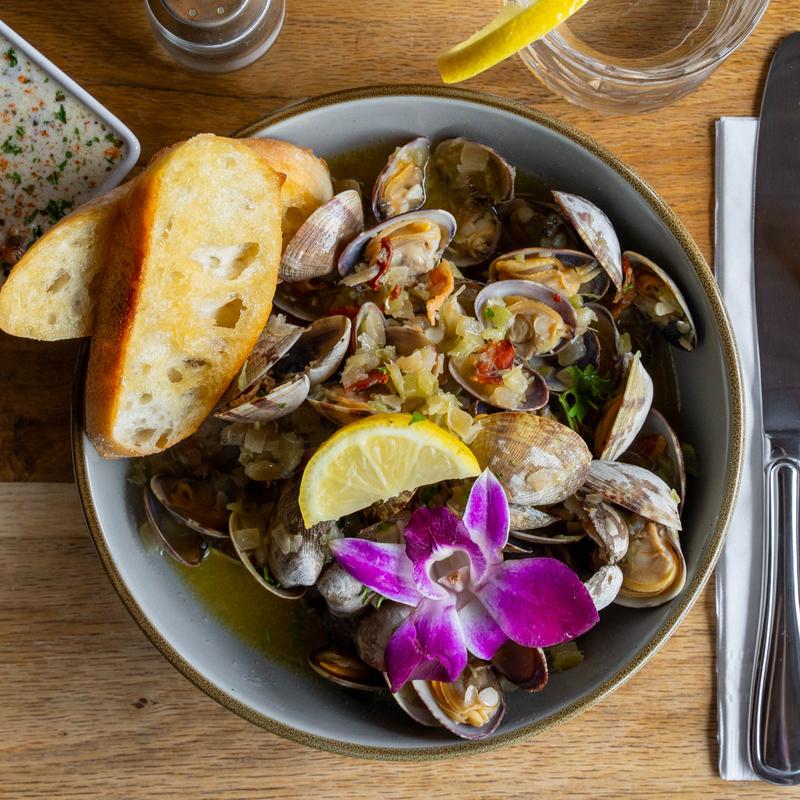 Full pound of Willapa Bay steamers, white wine, garlic herbs, bacon, butter, and grilled baguette