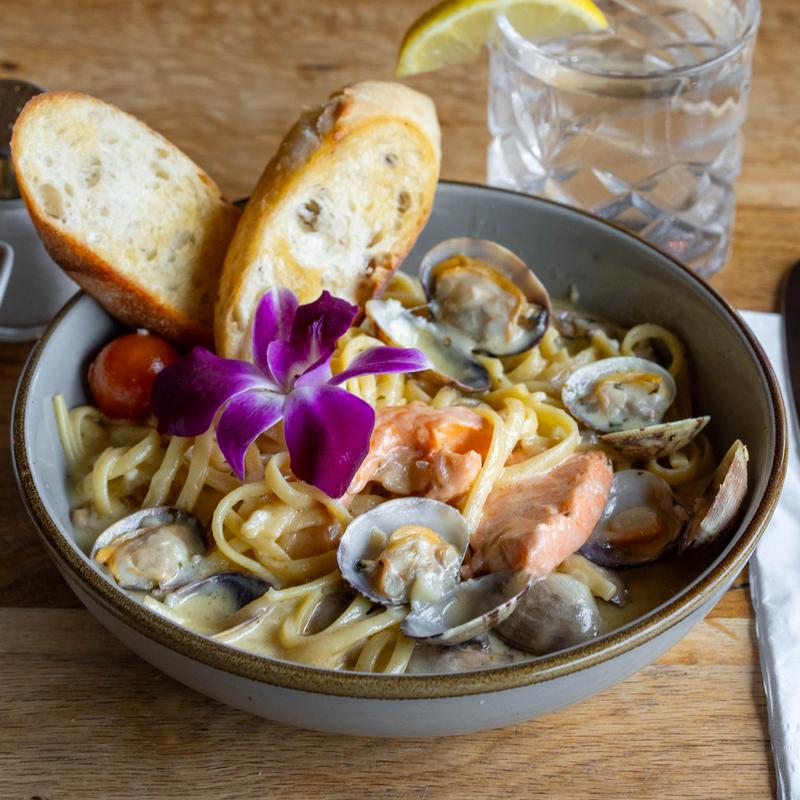 Wild-caught salmon, prawns, Manila clams, linguini, mushrooms, cherry tomatoes, and savory lemon cream sauce