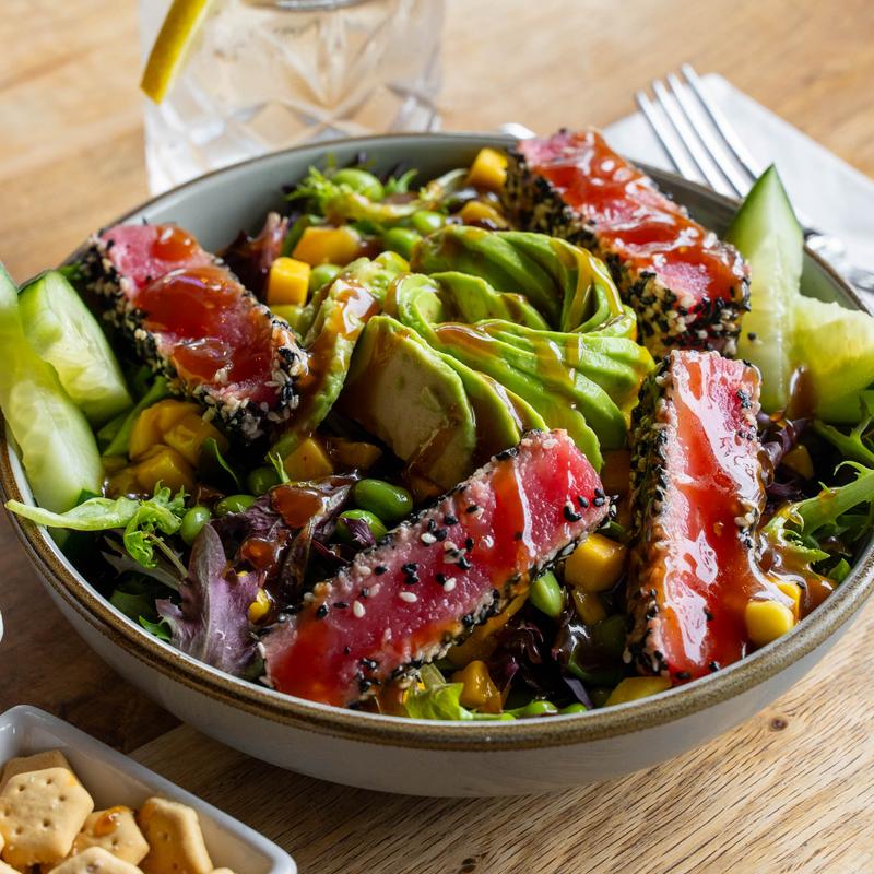 Arcadian blend lettuce, mango, avocado, edamame, cucumber, Asian sesame dressing, and seared ahi tuna
